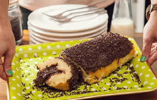 Molhe uma faca grande para cortar o rocambole. Assim, ela não vai grudar no recheio.